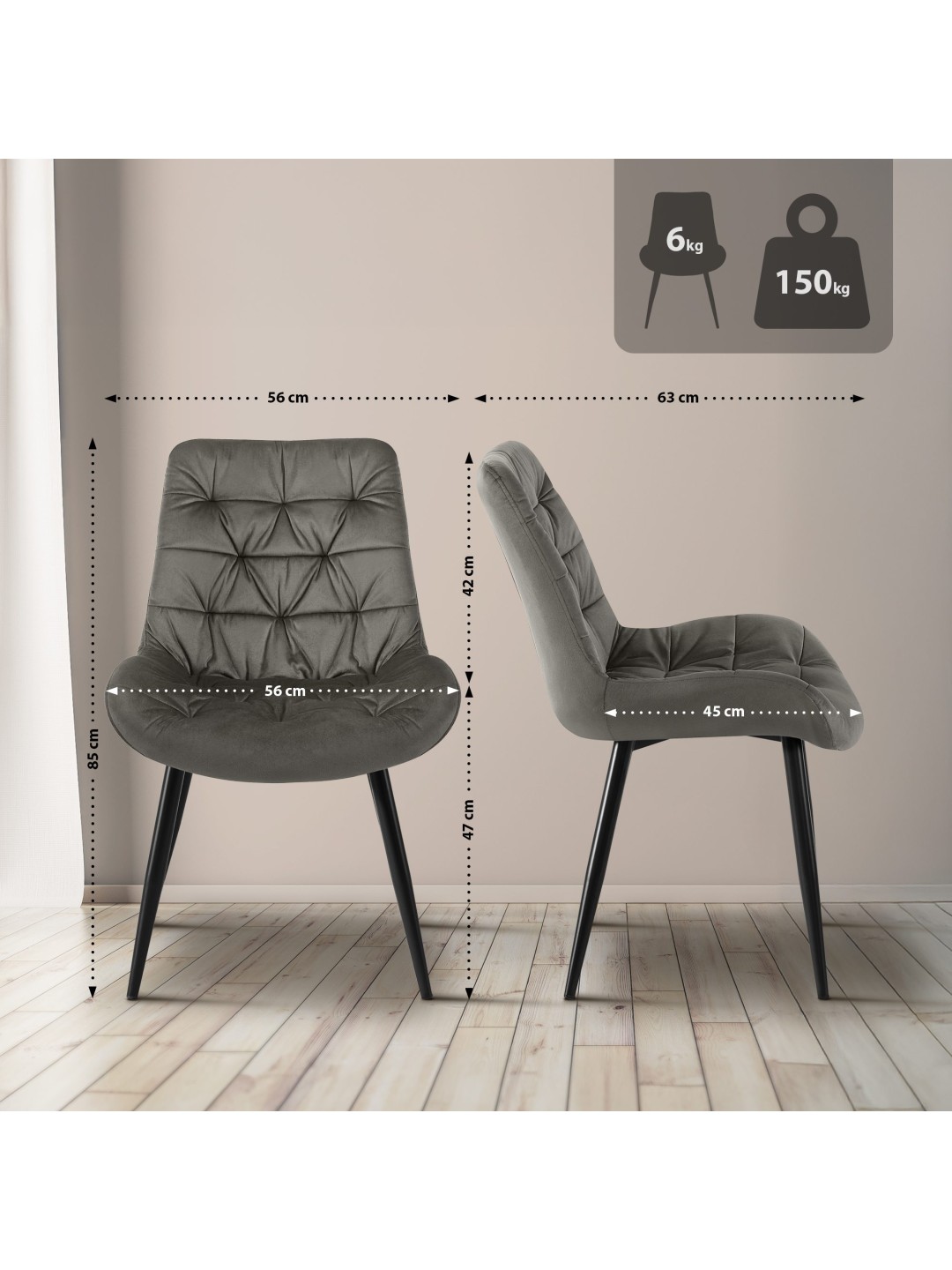 Nøglen til et behageligt sæde er den behagelige polstring over sæde og ryglæn. Både sædeskallen og ryglænet er beklædt med et fløjlsbetræk, der er nemt at vedligeholde. Det smarte quiltede mønster skaber et blikfang.