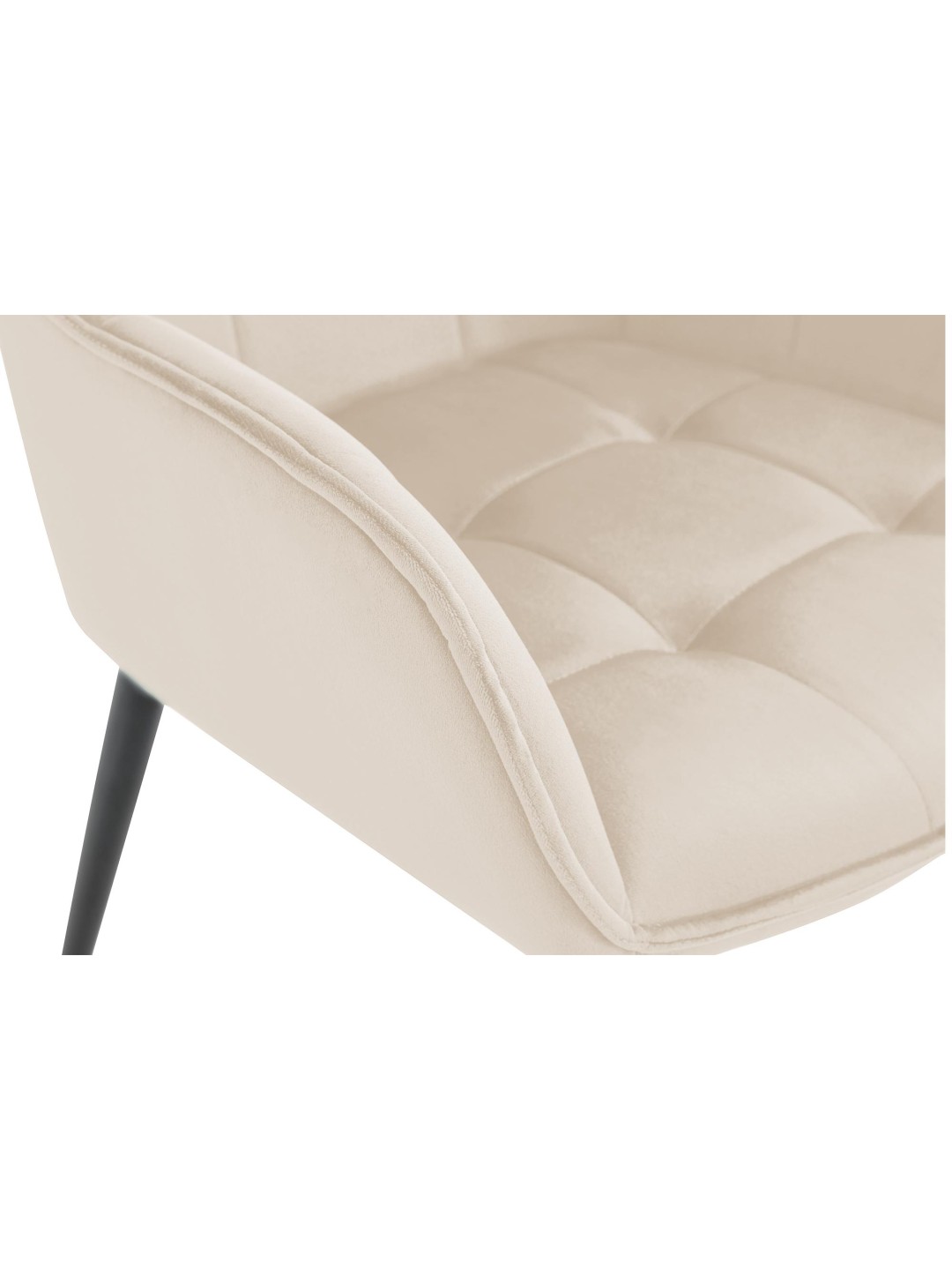 Denne spisestuestol kombinerer moderne design med komfortabel funktionalitet. Det polstrede sæde og armlæn giver behagelig støtte. Det plejevenlige fløjlsbetræk sikrer et stilrent look, mens den robuste metalramme med gulvbeskyttere beskytter gulvet mod ridser og forhindrer, at det glider. Med en bæreevne på op til 150 kg og en ergonomisk form er lænestolen ideel til lange siddeperioder. Lænestolen fås i forskellige farver. Denne stol passer harmonisk ind i forskellige indretningsstile - perfekt til spisestuen, soveværelset eller som læsestol.