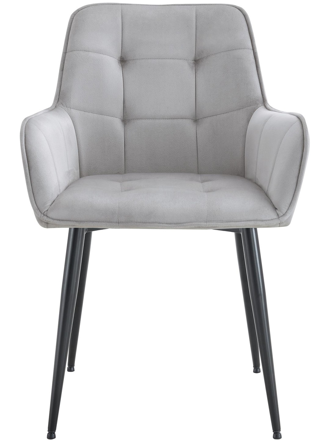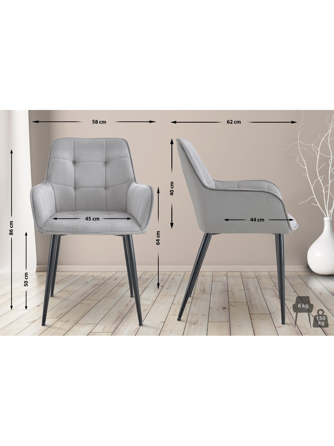 Denne spisestuestol kombinerer moderne design med komfortabel funktionalitet. Det polstrede sæde og armlæn giver behagelig støtte. Det plejevenlige fløjlsbetræk sikrer et stilrent look, mens den robuste metalramme med gulvbeskyttere beskytter gulvet mod ridser og forhindrer, at det glider. Med en bæreevne på op til 150 kg og en ergonomisk form er lænestolen ideel til lange siddeperioder. Lænestolen fås i forskellige farver. Denne stol passer harmonisk ind i forskellige indretningsstile - perfekt til spisestuen, soveværelset eller som læsestol.