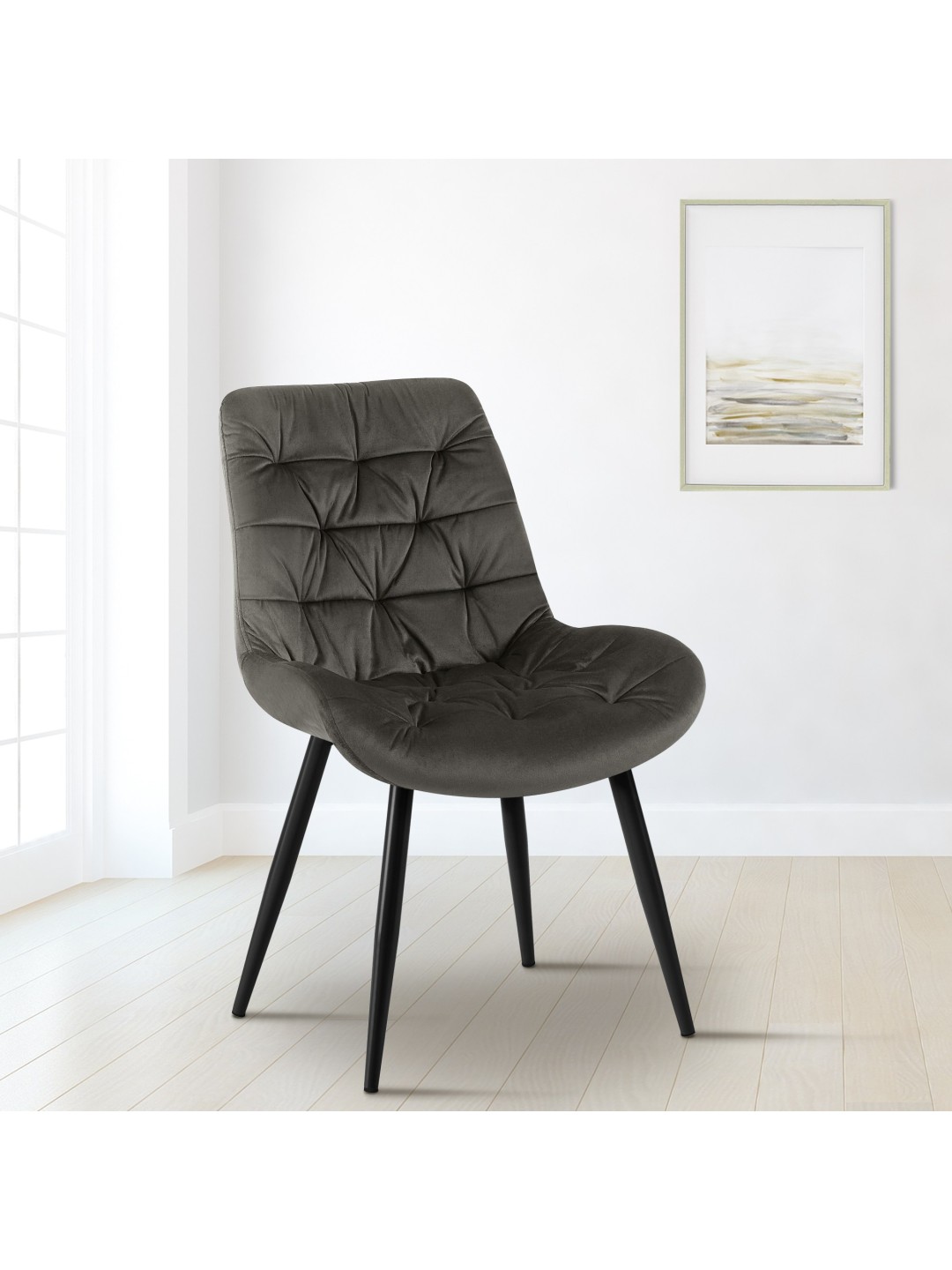 Den behagelige polstring af sæde og ryglæn, som er udstyret med et let pleje og robust fløjlsbetræk, sikrer maksimal siddekomfort. Den robuste firbenede ramme af matsort metal sikrer et sikkert stativ og en bæreevne på op til 150 kg. Gulvbeskyttere beskytter følsomme gulve mod ridser og skader og forlænger stolens levetid.