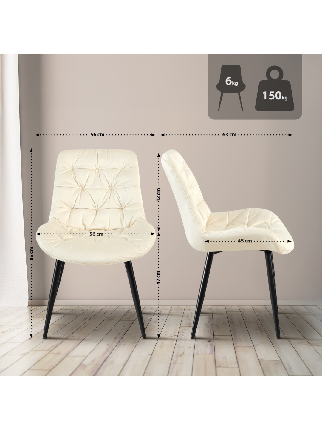 Den behagelige polstring af sæde og ryglæn, som er udstyret med et let pleje og robust fløjlsbetræk, sikrer maksimal siddekomfort. Den robuste firbenede ramme af matsort metal sikrer et sikkert stativ og en bæreevne på op til 150 kg. Gulvbeskyttere beskytter følsomme gulve mod ridser og skader og forlænger stolens levetid.