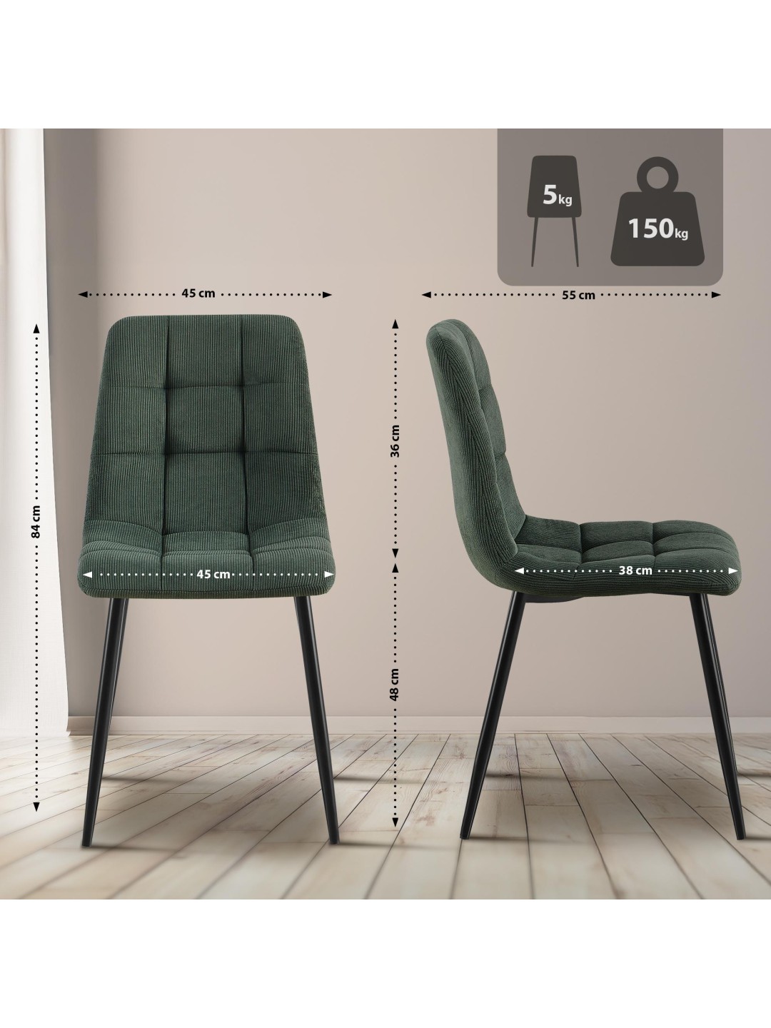 Sæt med 2 spisestuestole Antibes Cord, grøn