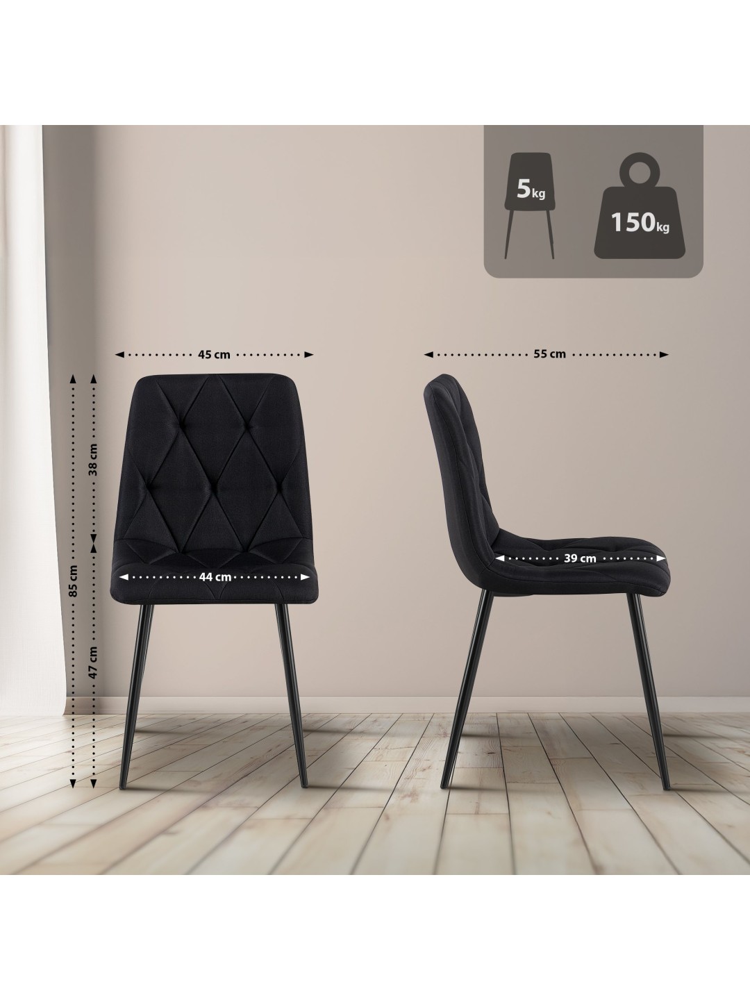 Fundamentet for denne spisestuestol er det stabile firbenede stel lavet af sort, pulverlakeret metal. Det betyder, at Clairton stolen sikkert kan belastes med op til 150 kg. Gulvbeskyttere forhindrer skader på følsomme gulve.