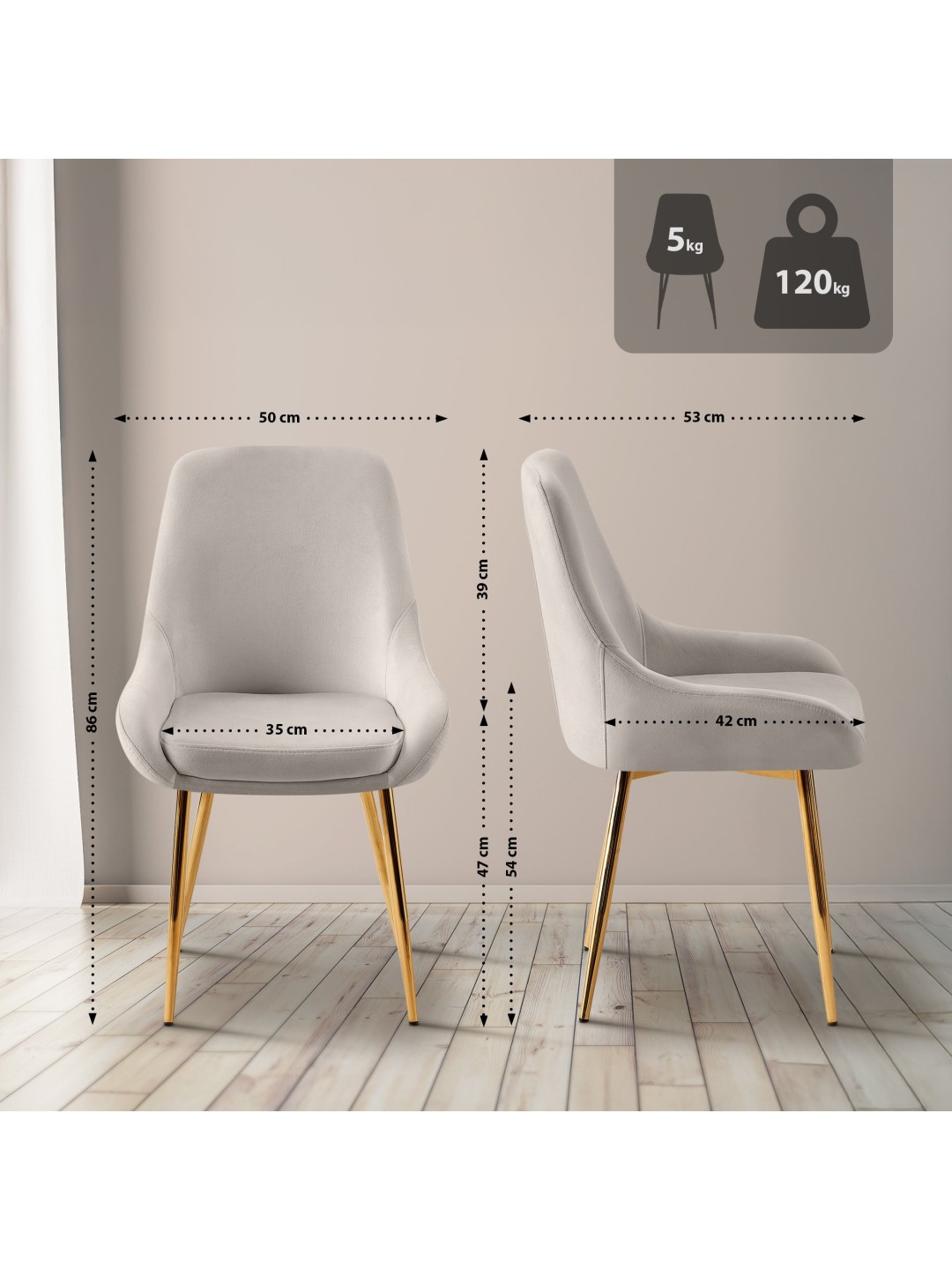 Sæt med 2 spisestuestole Elmira fløjlsguld, grå