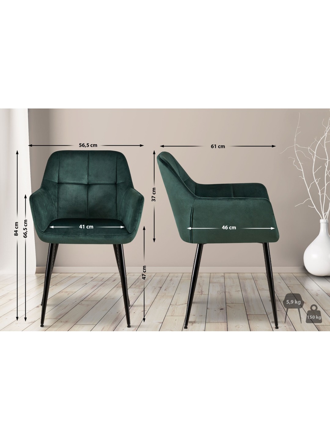 Sæt med 2 spisestuestole Emia velvet, grøn