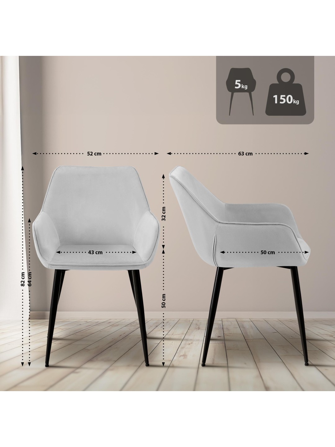 Fundamentet for disse spisebordsstole er de stabile firbenede stel lavet af sort, pulverlakeret metal. Det betyder, at Vessa-stolene sikkert kan belastes med op til 150 kilo. Gulvbeskyttere forhindrer skader på følsomme gulve.