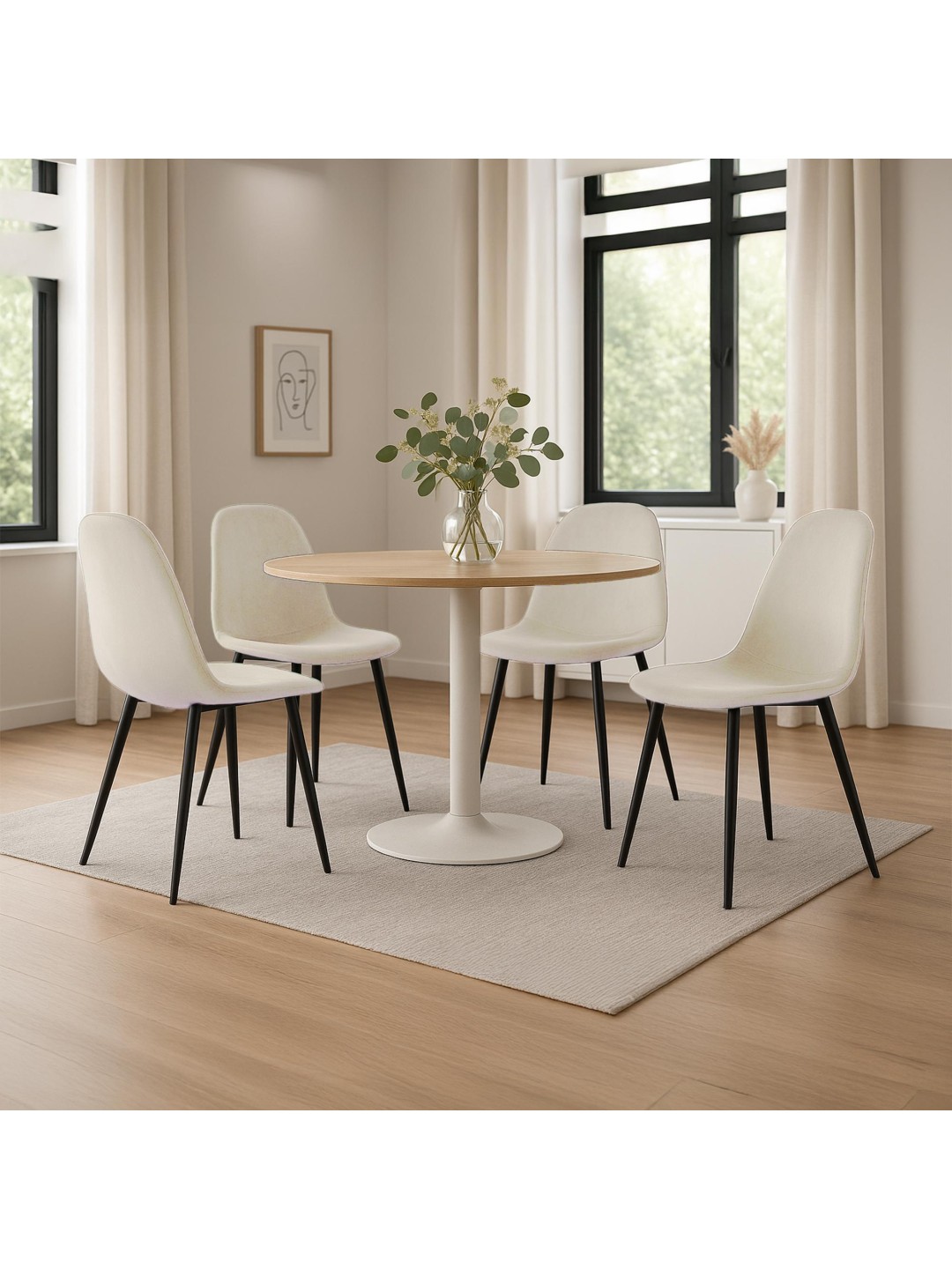 Fundamentet for disse spisebordsstole er de stabile firbenede stel af sort, pulverlakeret metal. Det betyder, at stolene sikkert kan belastes med op til 150 kilo. Gulvbeskyttere forhindrer skader på følsomme gulve.