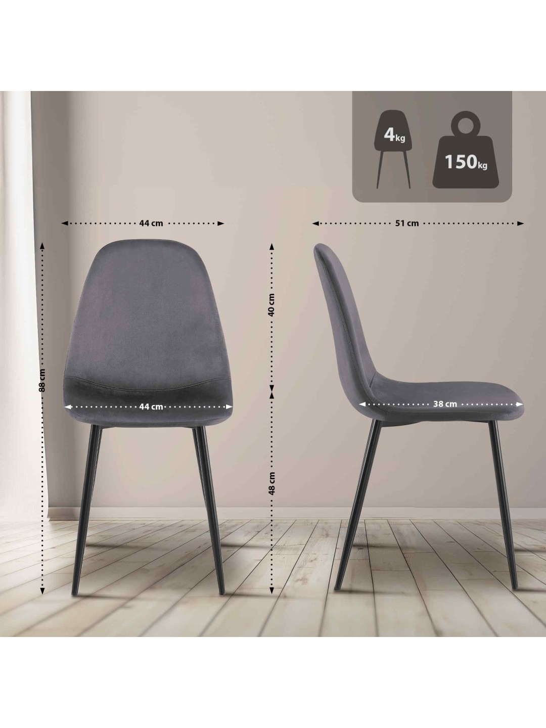 Fundamentet for disse spisebordsstole er de stabile firbenede stel af sort, pulverlakeret metal. Det betyder, at stolene sikkert kan belastes med op til 150 kilo. Gulvbeskyttere forhindrer skader på følsomme gulve.