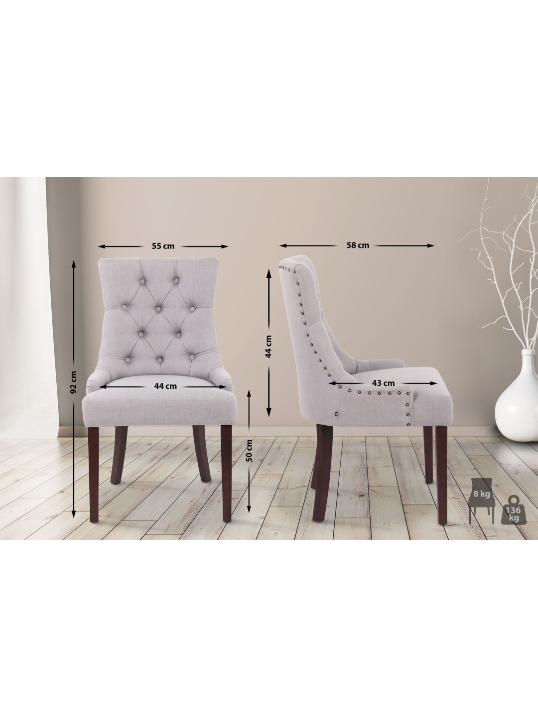 Din stemning bliver stilfuldt oplivet af Aberdeen spisestuestolen. Med et polstret stofbeklædt sæde og smukke dekorative syninger og knapper skaber denne stol et smagfuldt design. Denne lænestol står stabilt og stabilt på et firbenet stel af gummitræ. Det er et behageligt, solidt og samtidig stilrent sæde til hverdagsbrug og det perfekte supplement til moderne rum.