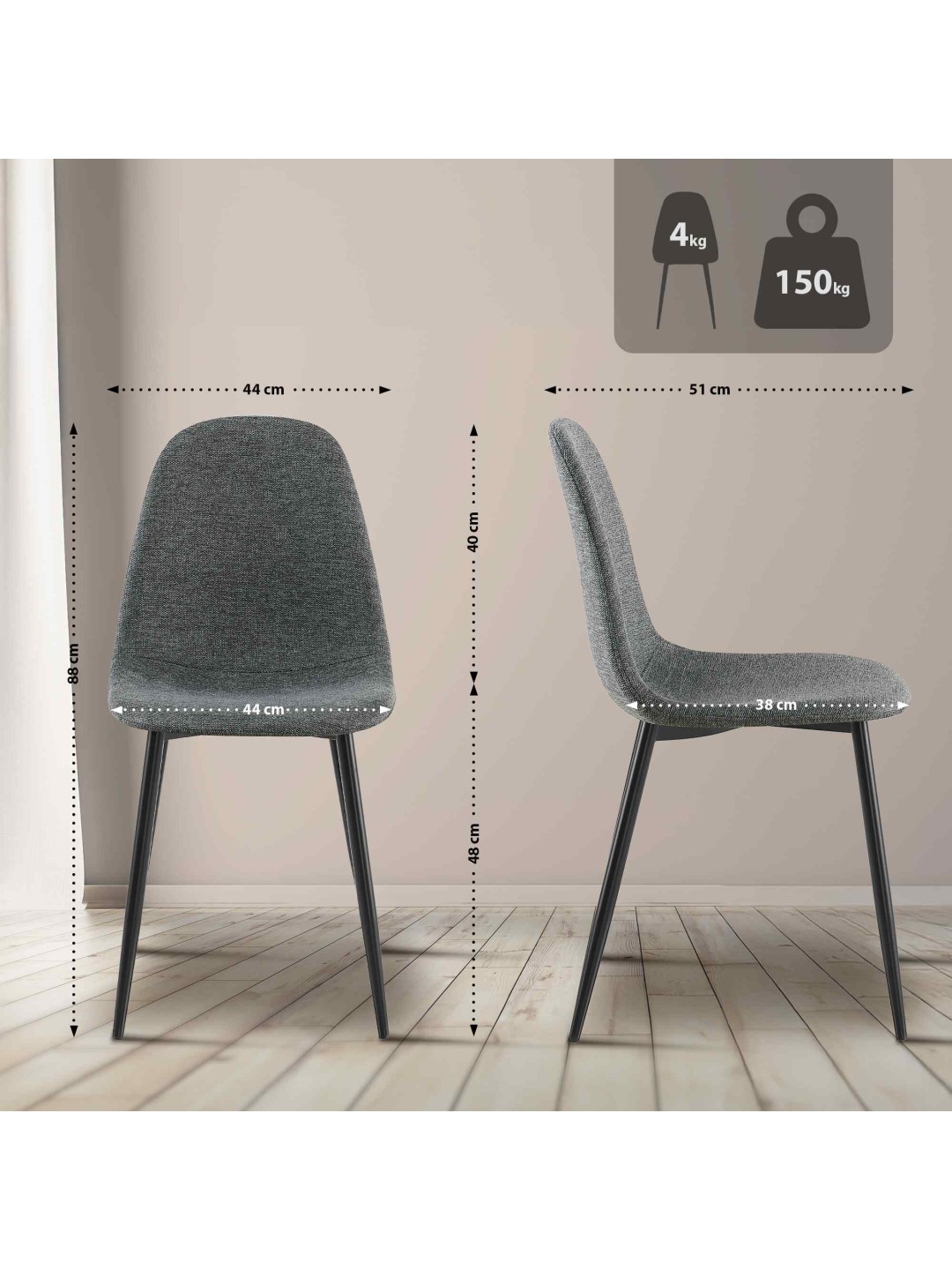 Fundamentet for denne spisestuestol er det stabile firbenede stel lavet af sort, pulverlakeret metal. Det betyder, at Napier stolen sikkert kan belastes med op til 150 kilo. Gulvbeskyttere forhindrer skader på følsomme gulve.