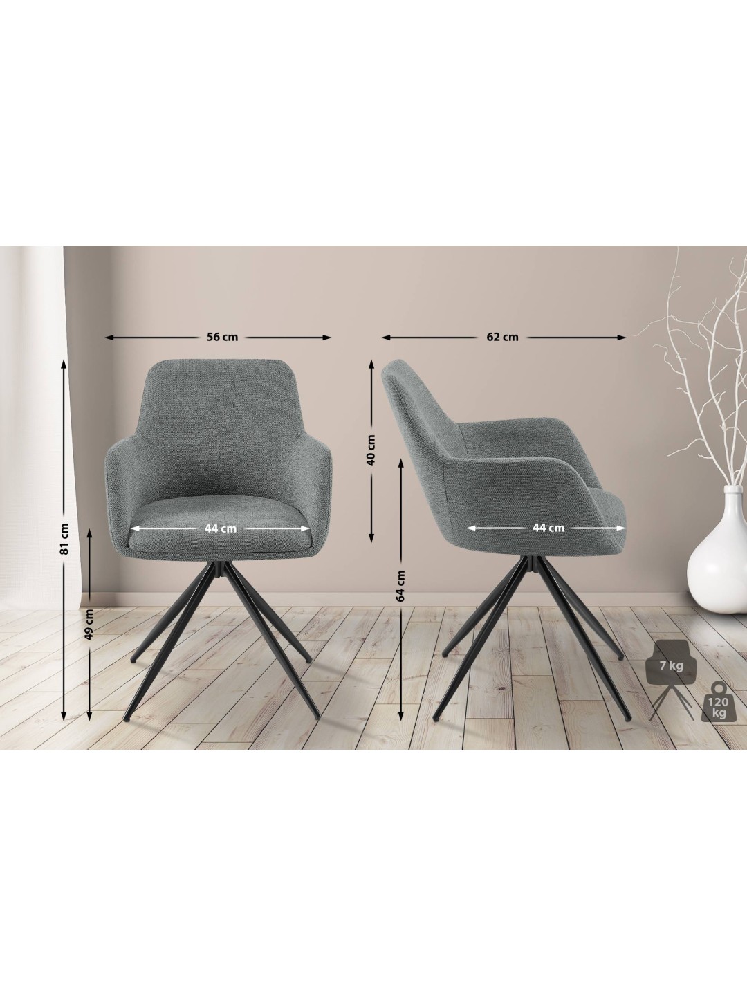 Nøglen til et behageligt sæde er den behagelige polstring over sæde, ryglæn og armlæn. Sædeskallen er beklædt med et let pleje og robust stofbetræk. Den såkaldte drejefunktion sikrer, at sædet kan drejes 180 grader, hvilket giver ekstra bevægelsesfrihed.