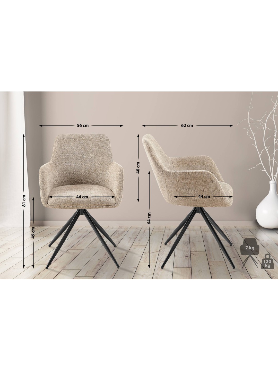 Fundamentet for denne lænestolslignende stol er det matsorte firbenede stel af pulverlakeret metal. Det betyder, at Olema spisestuestolen kan belastes sikkert med op til 120 kilo.