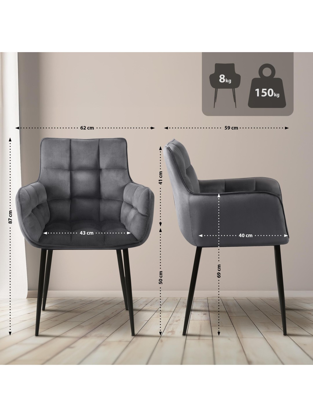 Nøglen til et behageligt sæde er den behagelige polstring over sæde, ryglæn og armlæn. Sædeskal og ryglæn er fuldstændig dækket af fløjl. Det ternede quiltede mønster skaber et elegant look.